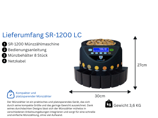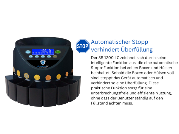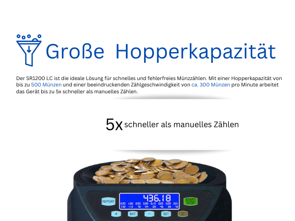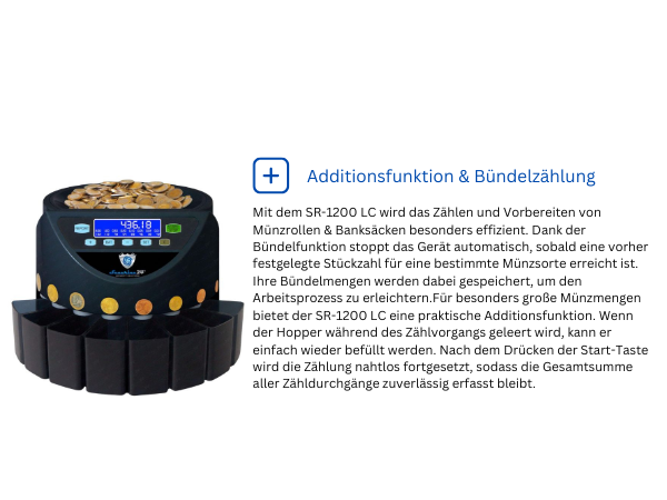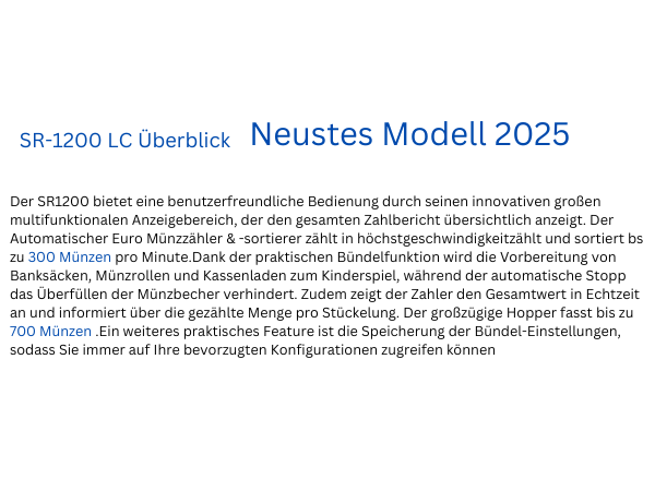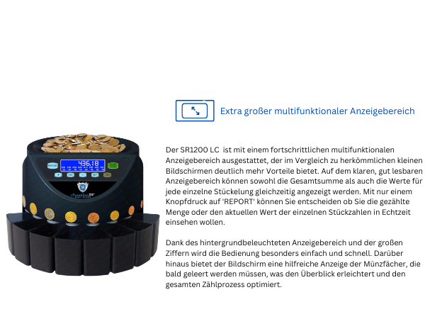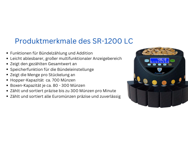 Der SR-1200 LCD ist ein professioneller elektronischer Münzzähler, der im gesamten gewerblichen Handel und Verkauf einsetzbar ist. Er sortiert alle Münzeinheiten einer Währung (Euro) in verschiedene Boxen und zeigt die Gesamtzählsumme und die Einzelsummen jeder Münzeinheit in Echtzeit während der Zählung im LCD Display an.